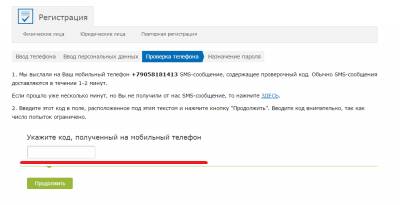 - Код, присланный в смс-ке на номер телефона, ввести в поле на сайте.
